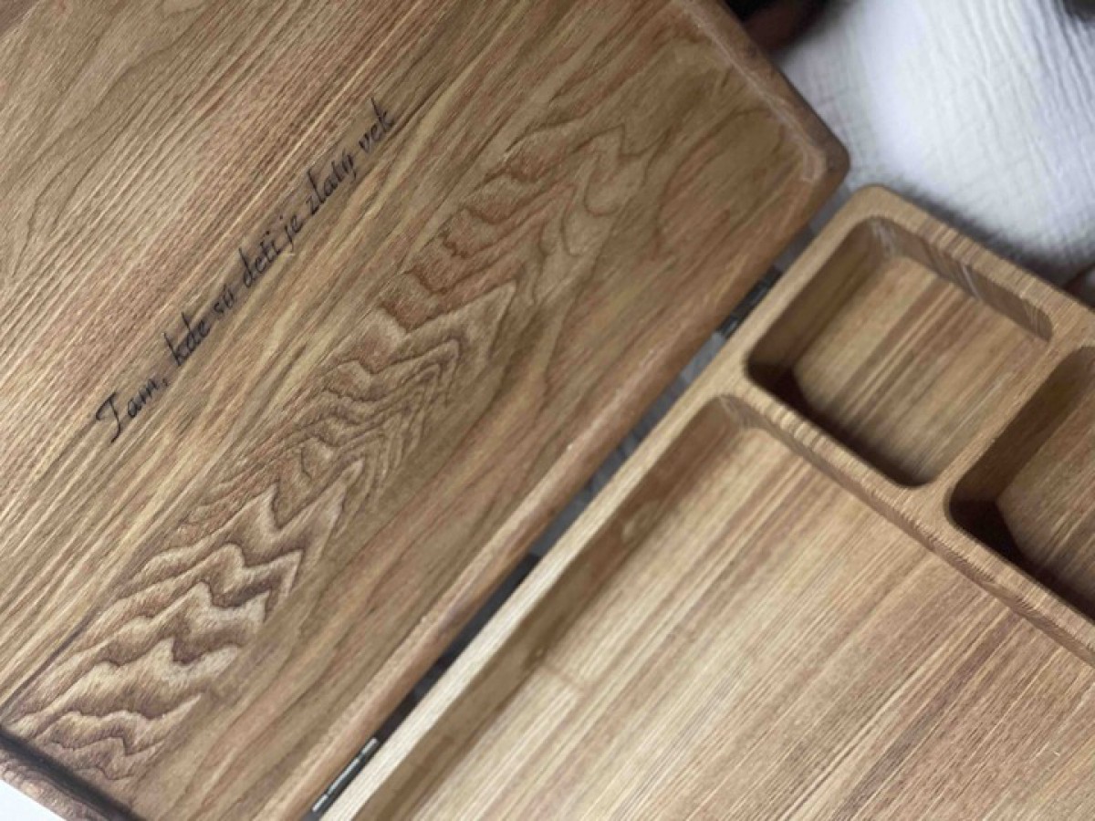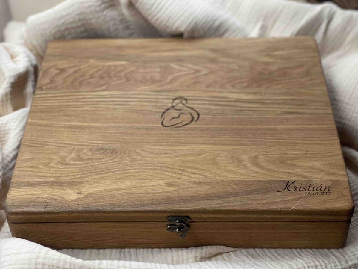 - Veľkého memory boxu - Memory box je vyhotovený z masívneho dubového dreva s 3 oddeleniami pod rôzne drobnosti (prvé ponožky, cumlík, náramok z pôrodnice, zúbky...), jedným oddelením na tehotenský test a jadným oddelením pod našu knižku.